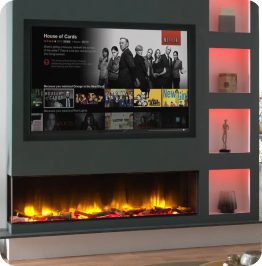 Modern electric or gas fireplaces integrated into custom-built wall units with shelving, tile or stone surrounds, and mounted TV spaces. A bold focal point that makes your basement feel warm, finished, and inviting. - Legal Basement Apartments / In-Law Suites
